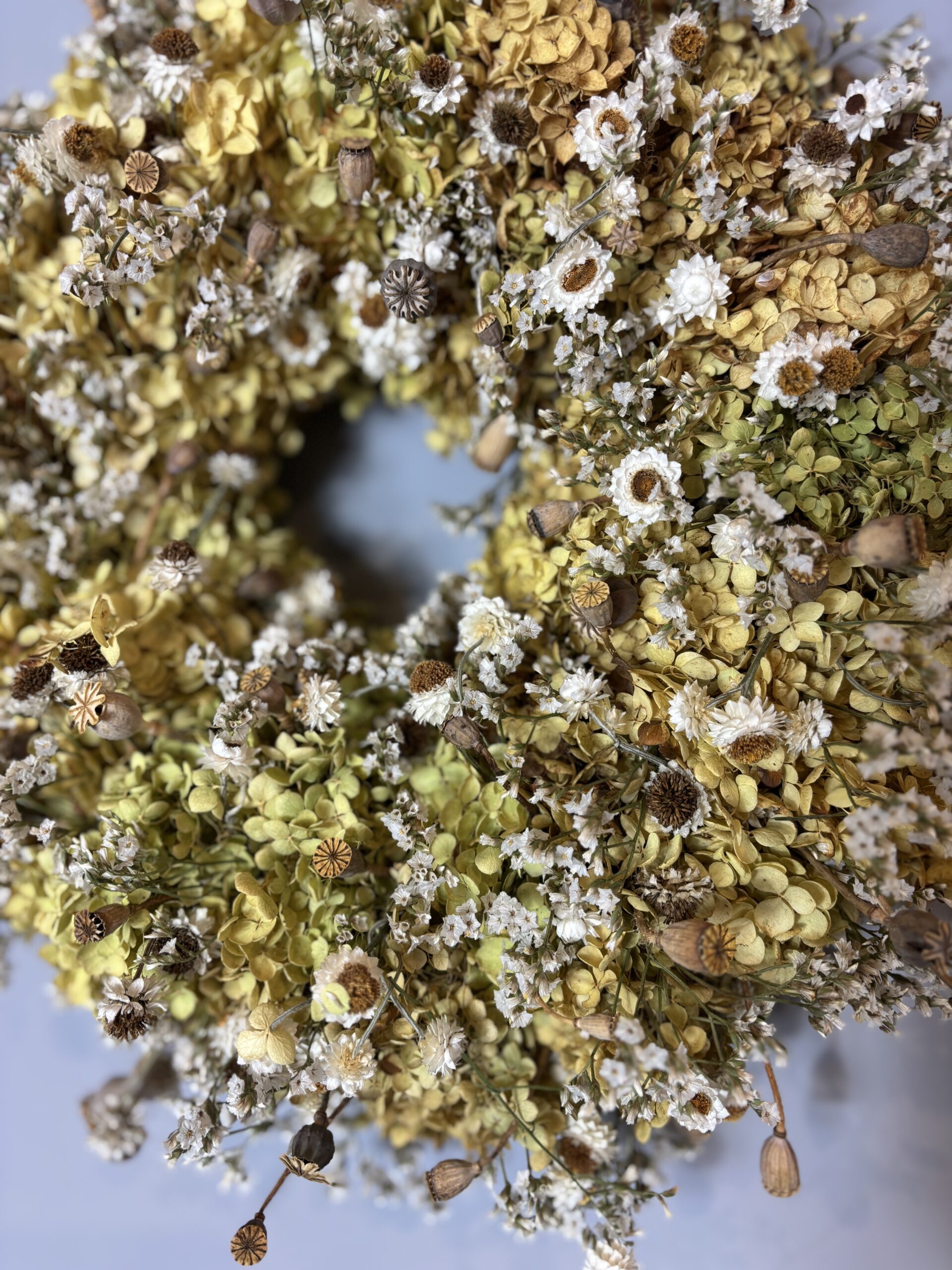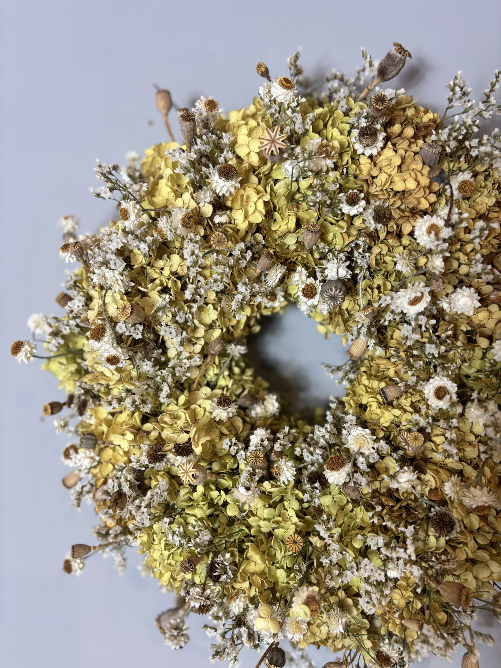 Ein Trockenblumenkranz aus regionalen Slowflowerblumen. Der Kranz ist farblich so neutral dass er das ganze Jahr im Raum hängen kann und nie seine Schönheit verliert.