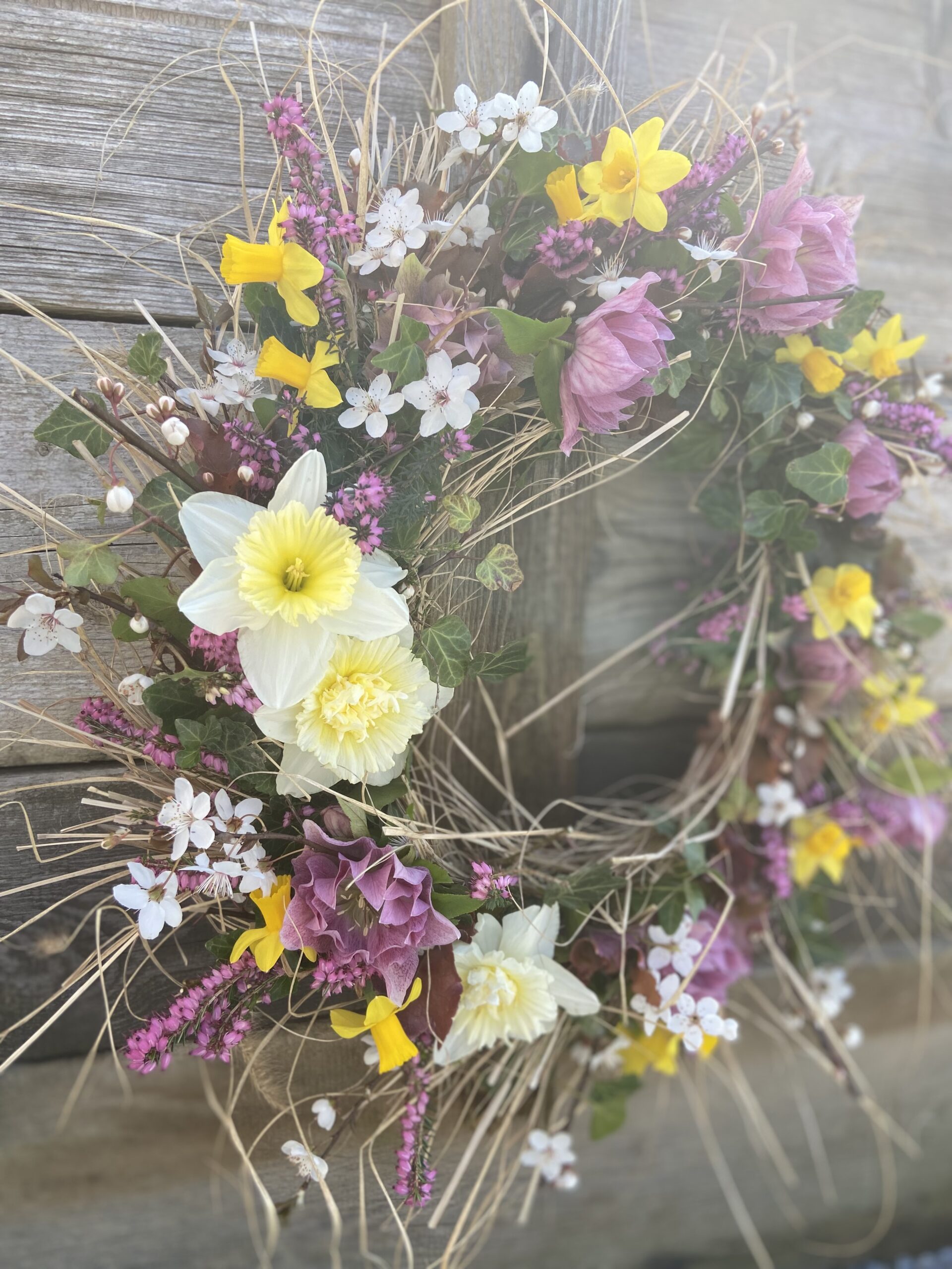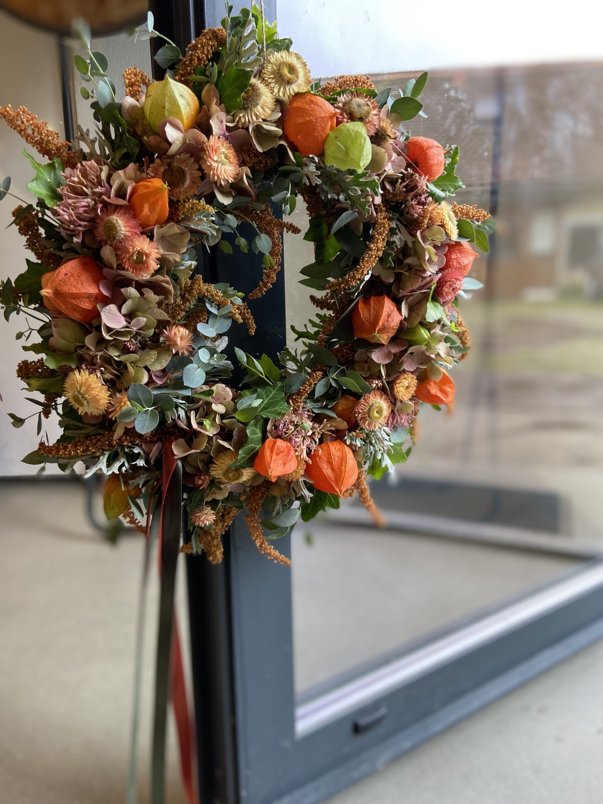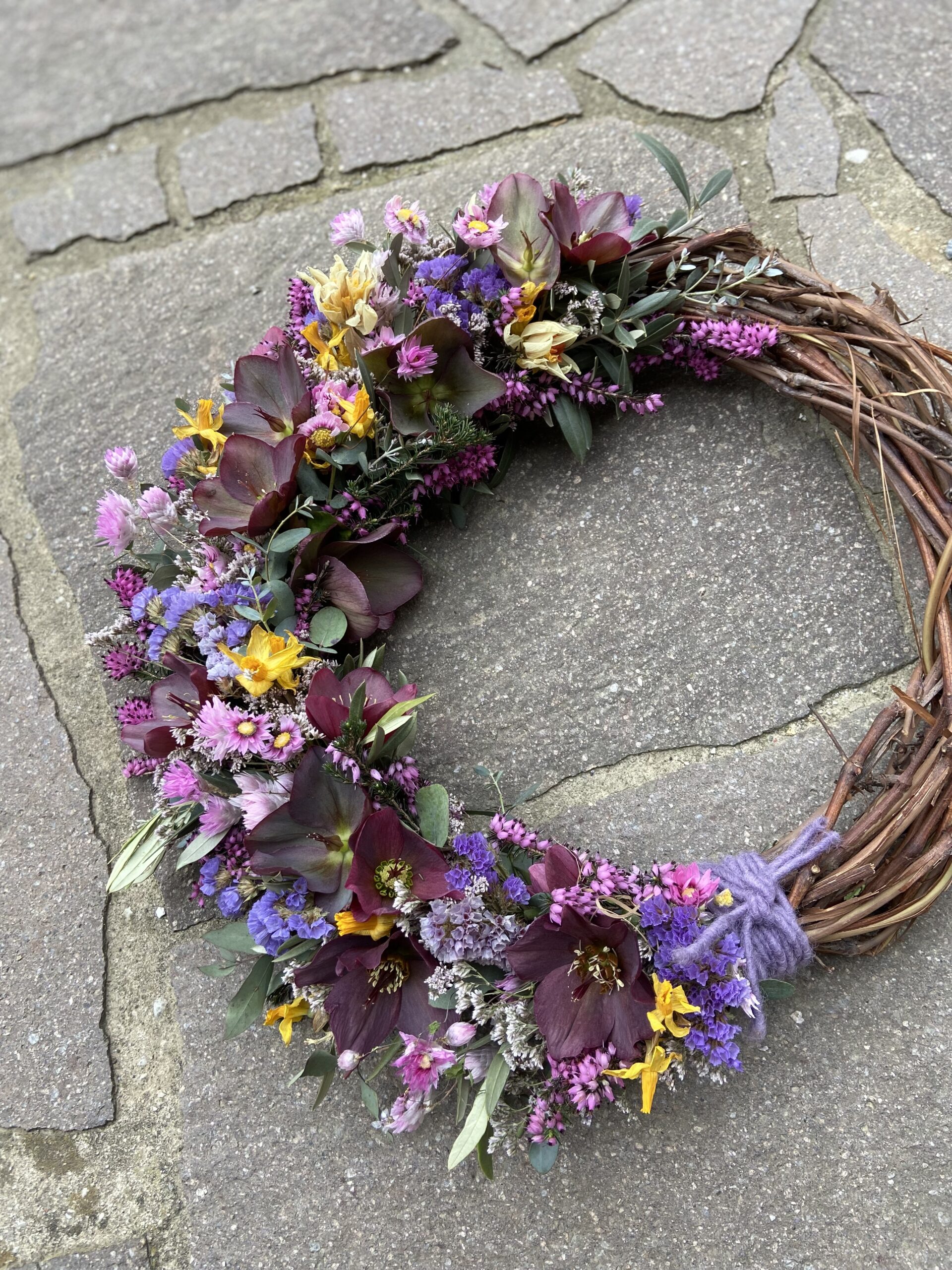Für dich wird ein saisonaler Türkranz angefertigt! Der Kranz wird auf einen Metallring gebunden und ist somit nicht zu schwer zum aufhängen.